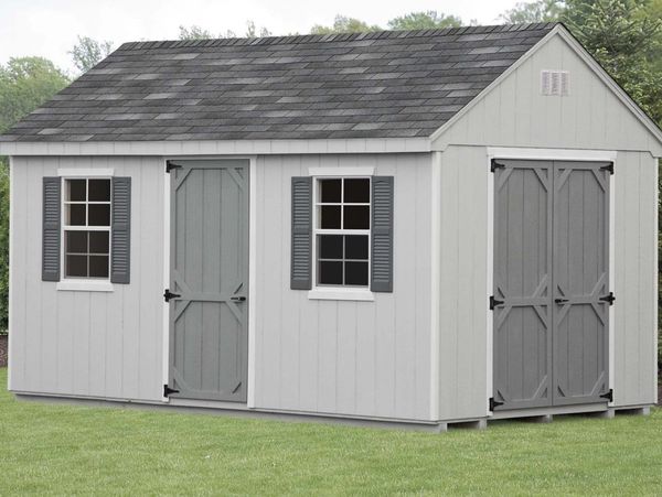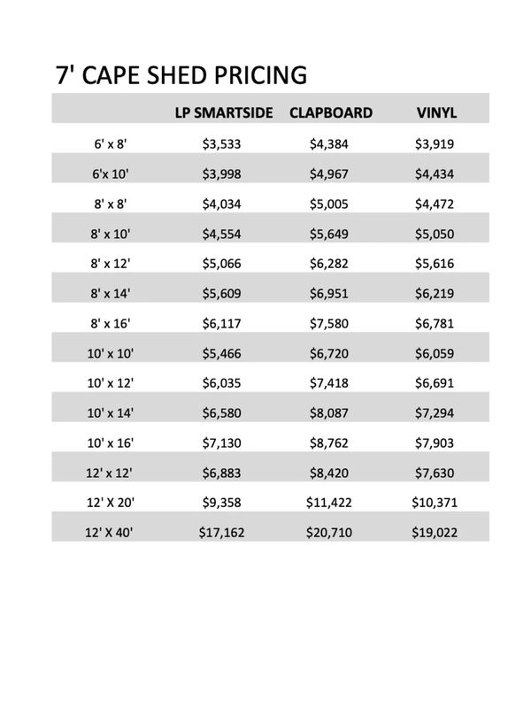 Standard features of our 7' Capes include one set of double doors with locking door handle. Buildings up to 10 feet in length have one window with a screen and buildings 12 feet and longer have two windows with screens. 8' wide sheds have a 4'6" door opening, 10' wide sheds have a 5' door opening, and 12' wide sheds have a 6' door opening. Cape models feature 18" x 27" windows, shutters and a 7/12 roof pitch.
