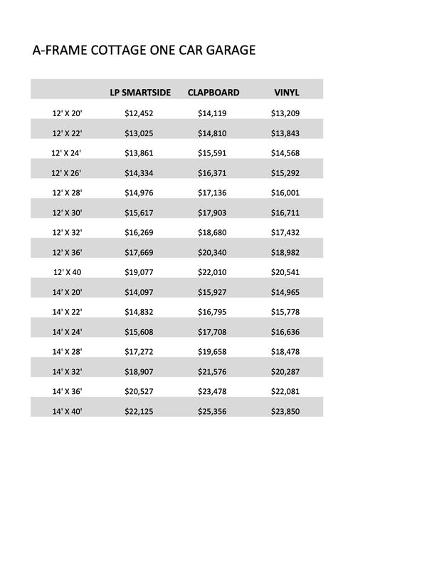Standard features of our Cottage A-Frame two-story one-car garage include: